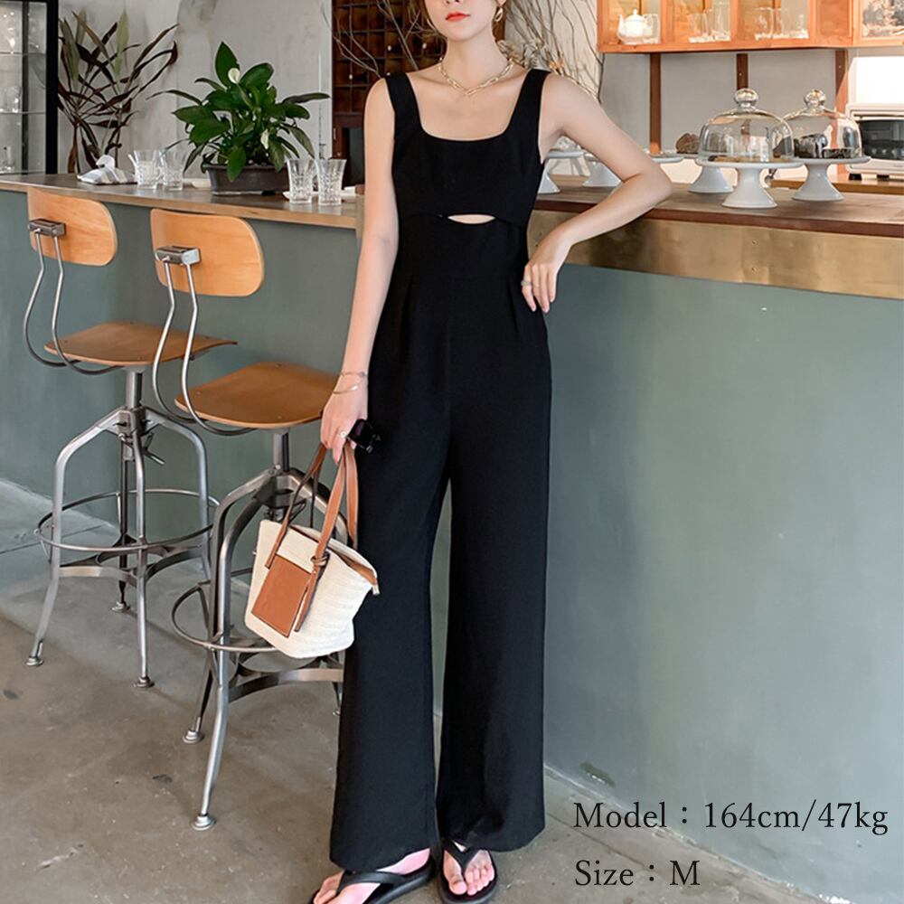 オーバーオール オールインワン ハイウエスト ロング丈 タンクトップサロペット 大人可愛い バギーパンツ 春夏 肩見せ セクシー ストレートパンツ