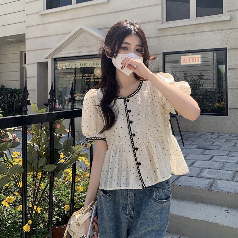 レディース服・おしゃれ・日系・水玉・半袖シャツ・細身・トップス♪