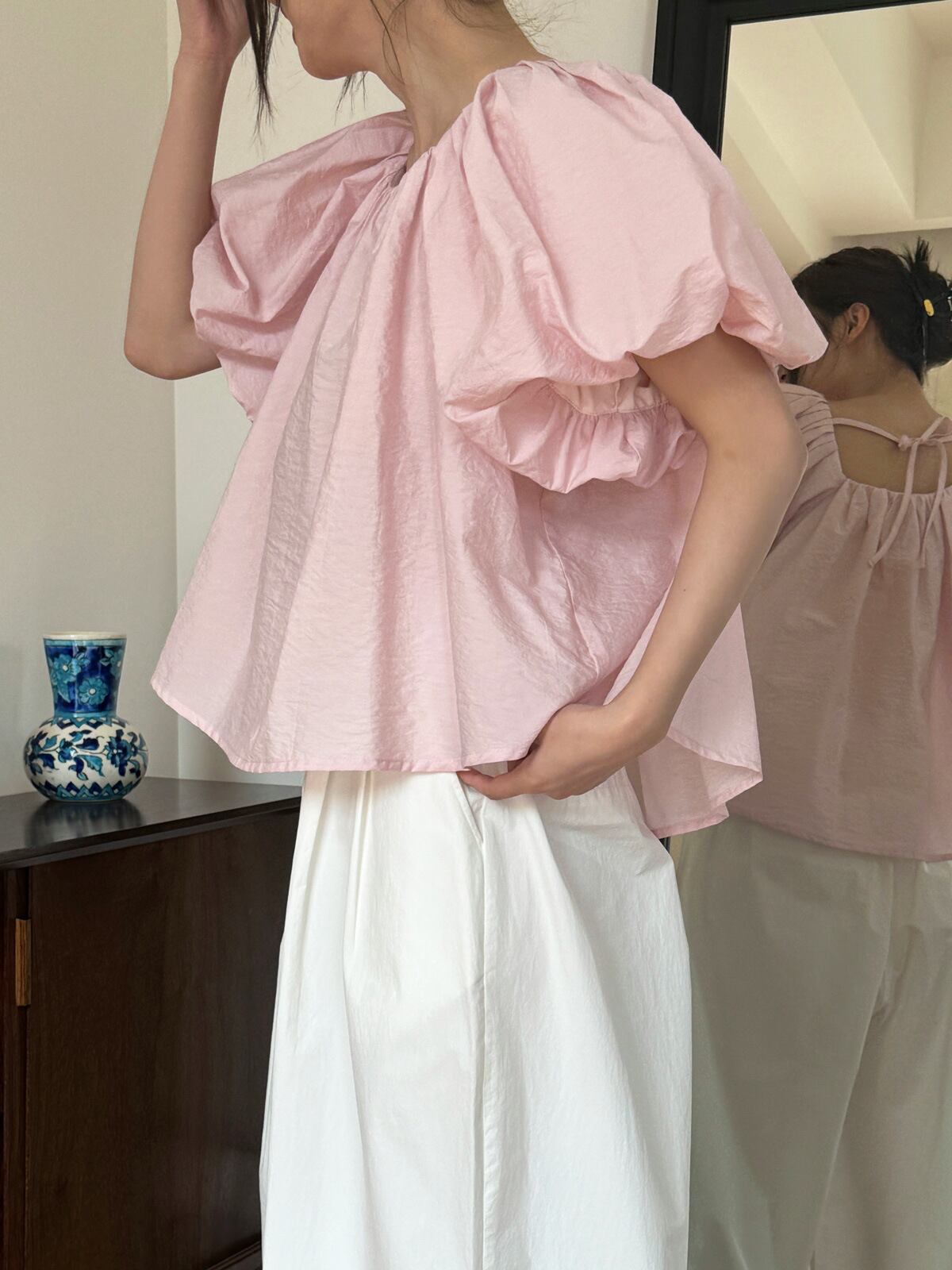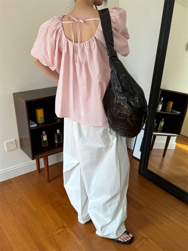 レディース シャツ トップス ブラウス 2024夏新作 パフスリーブ ラウンドネック